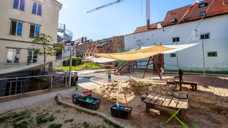 Unser Außenbereich begeistert alle Kinder allein schon wegen des Wasserspielplatzes. Es gibt aber auch ein Klettergerüst mit Schaukeln, einen Ballspielplatz und viel Platz für die "kleinen Rennfahrer" auf unseren Kinderfahrzeugen.