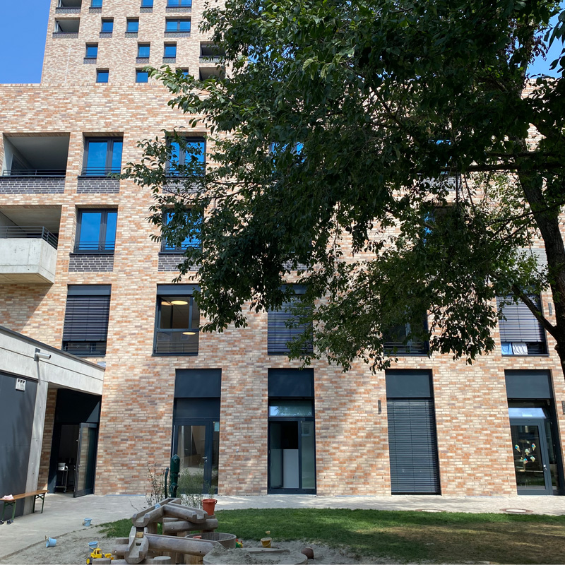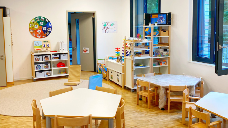 2024 zogen zwei Kitagruppen in den Neubau im Monikaviertel ein. Die Gruppenräume bieten Platz für alle Belange. Neben den Gruppenräumen gibt es gemütliche Schlafräume, eine Turnhalle und eine Kreativwerkstatt.