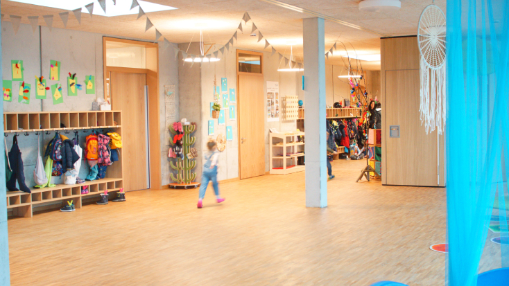 Der Kindergarten ist Teil des 2022 neu erbauten Kinderhauses "Kleine Heimat" auf dem Hollerhofgelände. Drei gemütliche Gruppenräume mit jeweiligem Ruheraum laden die Kinder zum Spielen, Austoben und Entspannen ein. Zusätzlich gibt es eine geräumige Turnhalle und einen großzügigen Gang. Hier stehen auch die Montessori-Materialien immer griffbereit, damit die Gruppen sie sich jederzeit zur Arbeit in den Gruppenraum holen können.