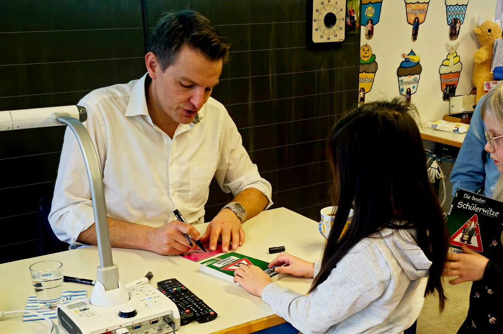 Das erste Buch heißt „Passt scho“ und handelt von Seppi in der Schule, in der er unter anderem viele Streiche den Lehrern spielt. Aus dem zweiten Buch „Lauter Deppen“ und aus dem achten Buch „Hammermäßig“ las er ebenfalls ein paar Kapitel vor und spielte sie teilweise mit Mitschülern nach. Am lustigsten fand ich die Fleischeroma, die mit Seppi und seinen Freunden im Bus mitfährt und dort ihren Enkel in Verlegenheit bringt. Im Anschluss durften wir dann noch alle Fragen stellen, die uns am Herzen lagen. Ich hatte mich schon Tage vorher auf das signierte Buch gefreut und dann hat Herr Schneider auch noch Postkarten mitgebracht, die wir signieren lassen konnten. Herr Schneider musste uns dann nach zwei ereignisreichen Stunden verlassen, um in der eigenen Klasse am Gymnasium Gaimersheim zu unterrichten. Unsere Lehrerinnen waren dann noch so nett und haben uns einige Schülerwitze aus dem vorher erhaltenen Schülerwitzebuch vorgelesen, bei denen wir alle gelacht haben. Mir hat die Autorenlesung sehr gut gefallen und es war für alle Kinder der Lerngruppen Jupiter und Erde ein besonderes Erlebnis!”