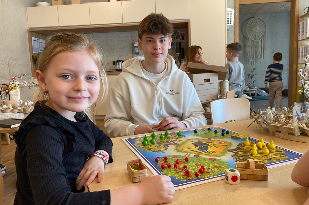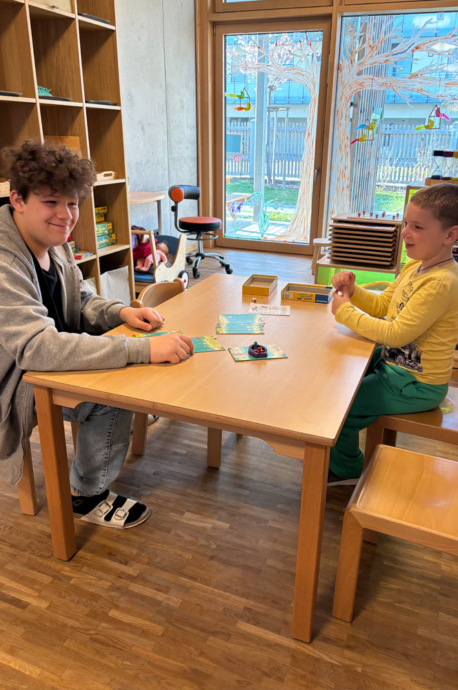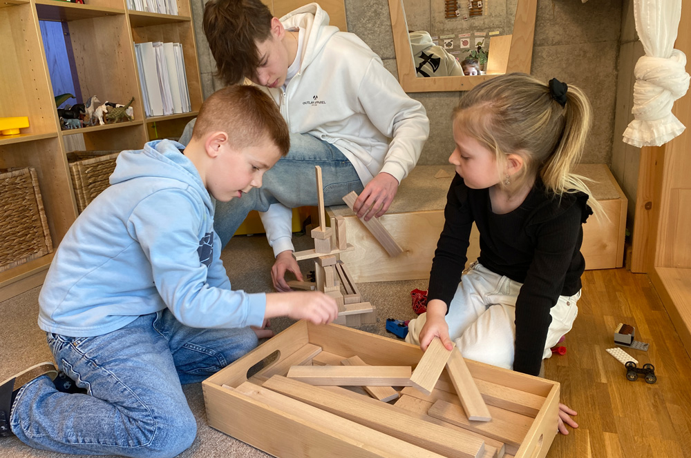 Auch ein paar Räume weiter, im Kindergarten der Kleinen Heimat in Münchsmünster sind die beiden 13-Jährigen gleich in Beschlag genommen worden. Timo spielt das Obstgarten-Spiel, das er noch aus seiner Kindergartenzeit kennt. Bei den Regeln müssen ihm die Kinder allerdings dann doch nochmal ein bisschen auf die Sprünge helfen. In der Bauecke drängeln sich die Kinder an seine Seite. Erzieherin Katharina Seeberg lacht: "So ist das, wenn mal so ein junger Erzieher da ist!" Alle wissen den besonderen Besuch zu schätzen: Kinder wie Erzieher.