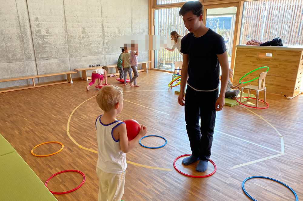 In der Turnhalle ist Tobias, Schüler der Realschule am Keltenwall Manching, mit den Kindern im Parcours unterwegs. Er erklärt die Stationen und macht selbst mit. Später lässt er sich von den Mädchen auch die Haare flechten. Für ihn ist das eine willkommene Abwechslung: "In der Schule haben wir gerade viel zu tun, da bin ich froh, heute einfach einen schönen Tag zu haben", erklärt er. Ob er später in Betracht zieht, eine Ausbildung zum Erzieher zu machen, ist aber völlig offen.