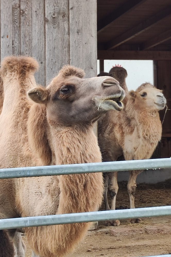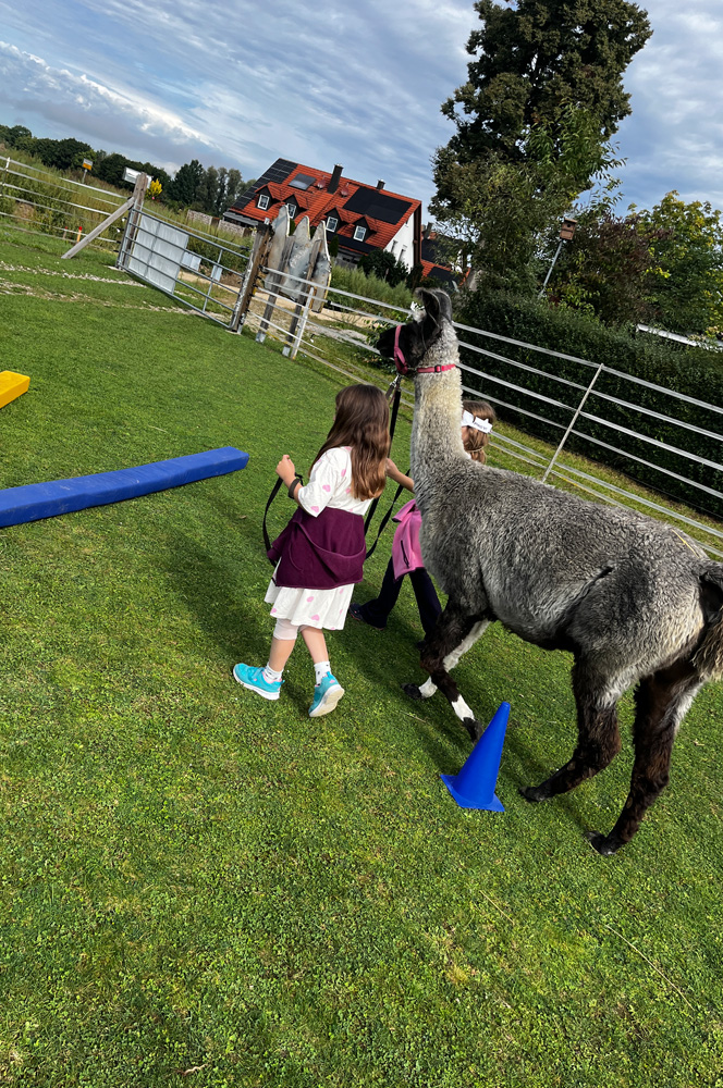 Nach einer freundlichen Begrüßung wurden die Kinder in drei Gruppen aufgeteilt, um verschiedene Stationen auszuprobieren. In der Alpaka-Station bemalten sie Holzmedaillen, die sie später stolz mit nach Hause nahmen. In der Lama-Station führten die Kinder zu zweit ein Lama oder ein Alpaka durch einen Parcours und konnten dabei Teamgeist und Geduld zeigen. Besonders aufregend war die Trampeltier-Station: Hier wurden die Tiere gestriegelt und die berühmten Höcker gestreichelt, die sich ganz besonders anfühlten.