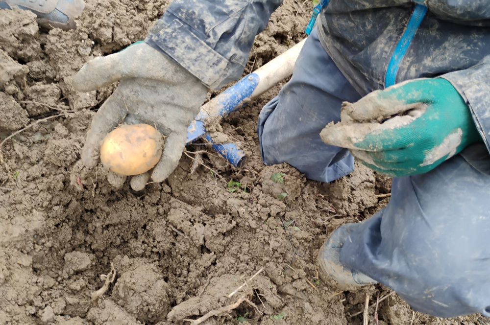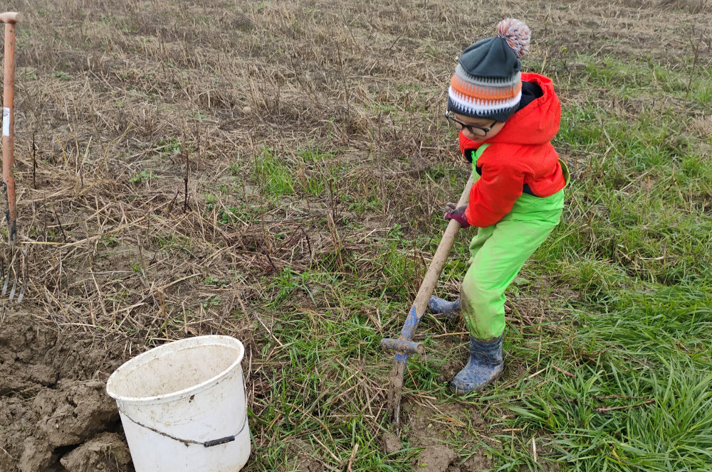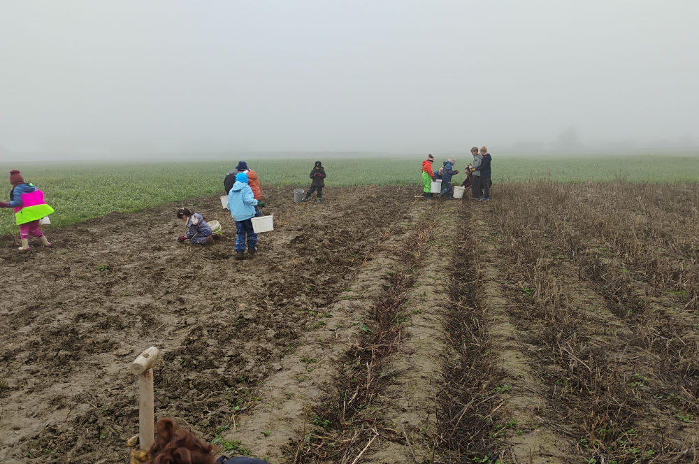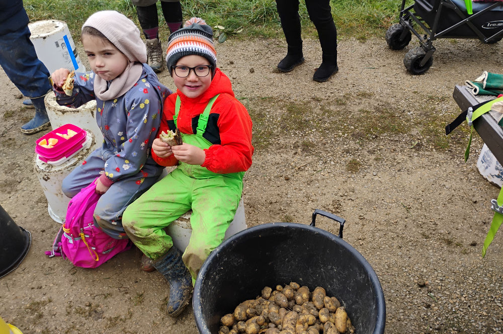Dort warteten noch unzählige Kartoffeln darauf, aus der Erde geholt zu werden. Die Kinder waren mit Feuereifer dabei, die Erde umzugraben und sich auf die Suche zu begeben. Die Freude war groß, egal ob große oder kleine Kartoffeln gefunden wurden. Neben den Kartoffeln gab es noch viele kleine Lebewesen zu entdecken, die genau unter die Lupe genommen wurden.