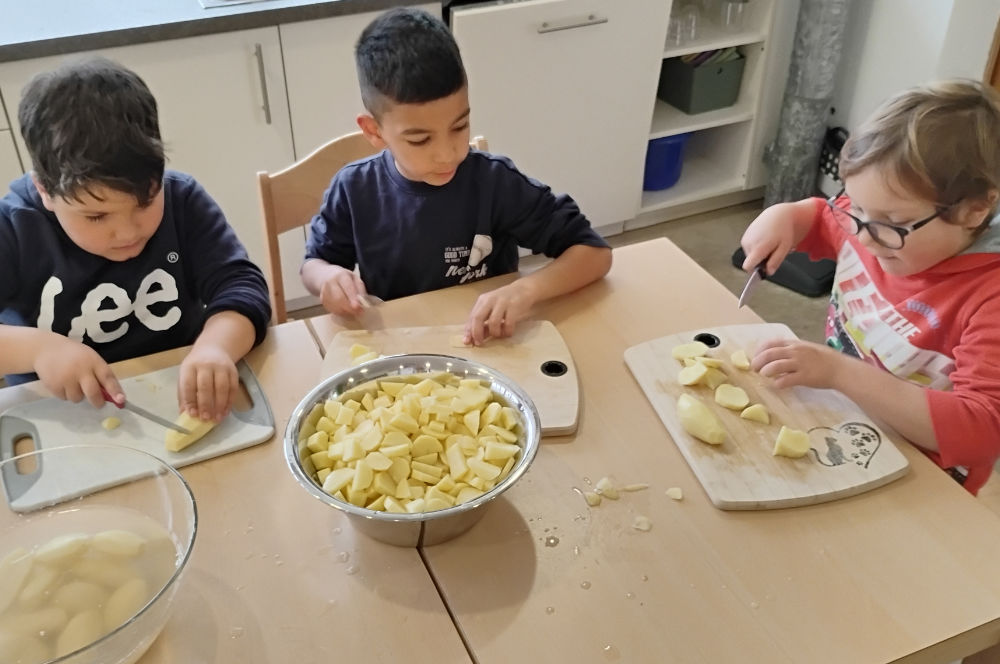 Am nächsten Tag stand die gemeinsame Zubereitung einer leckeren und gesunden Kartoffelsuppe auf dem Programm. Beim Schälen und Schneiden waren alle Kinderhände gefragt und gemeinsam wurde der Kochlöffel geschwungen. Das Fazit der Kinder lautete: "Selbstgemacht schmeckt es einfach am besten!"