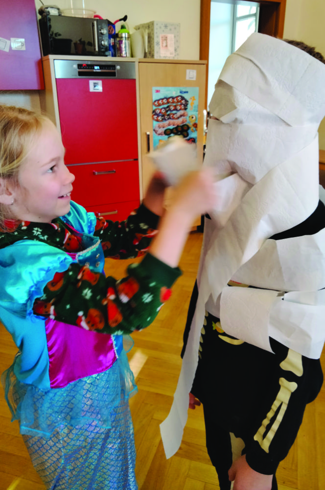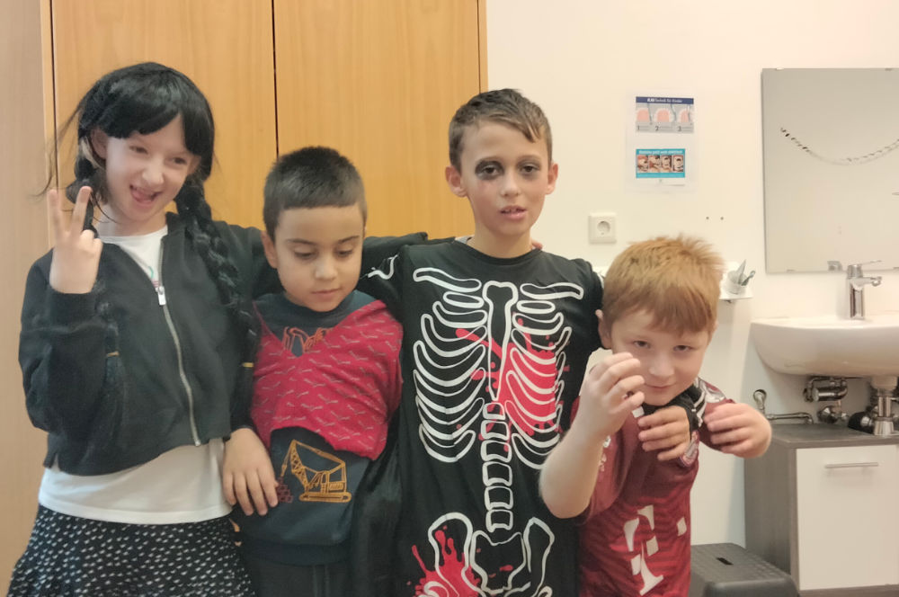 - Halloween-Party: Am Montag stieg in allen Gruppen eine große, aufregende Halloween-Party! Bei verschiedenen Stationen konnten sich die Kinder austoben. Ob beim Mumien-Einwickeln (ein Riesenspaß!), an der Katapult-Station, beim sportlichen Geister-Dosenabwerfen oder beim fantasievollen Schminken – die Freude am gemeinsamen Feiern war überall spürbar.