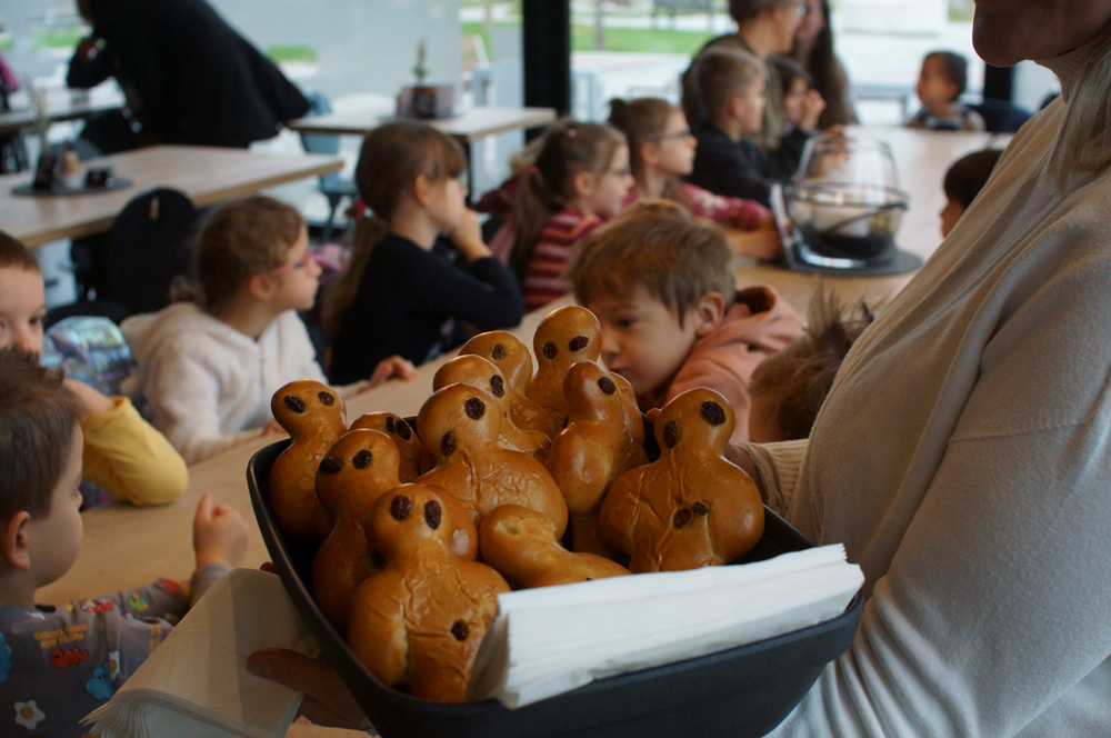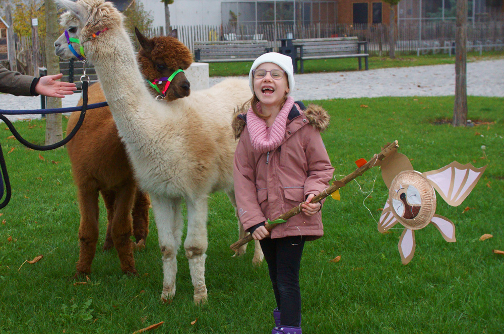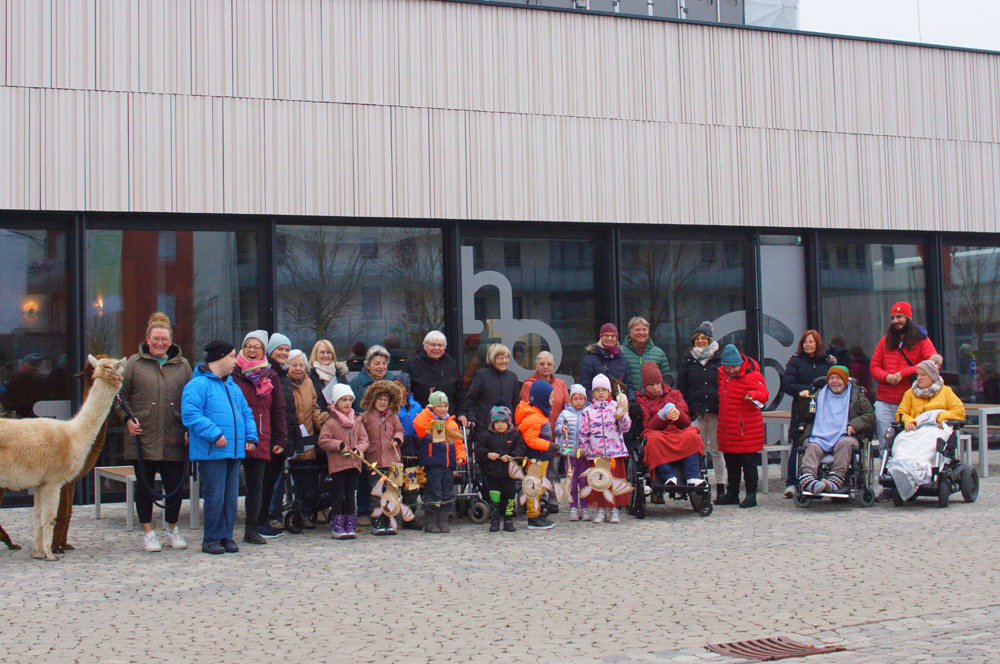 Die Alpakas und die Hollerhof-Klient:innen nahmen die 16 Kinder und ihre liebevoll gestalteten Laternen in die Mitte. So zogen sie einmal über’s Gelände. Bei einem der Gebäude für Betreutes Wohnen legten alle einen Stopp ein, um der Martinsgeschichte zu lauschen. Danach ging es zurück ins Café Holler, wo die duftenden Weckmänner und der Punsch schon bereitstanden.