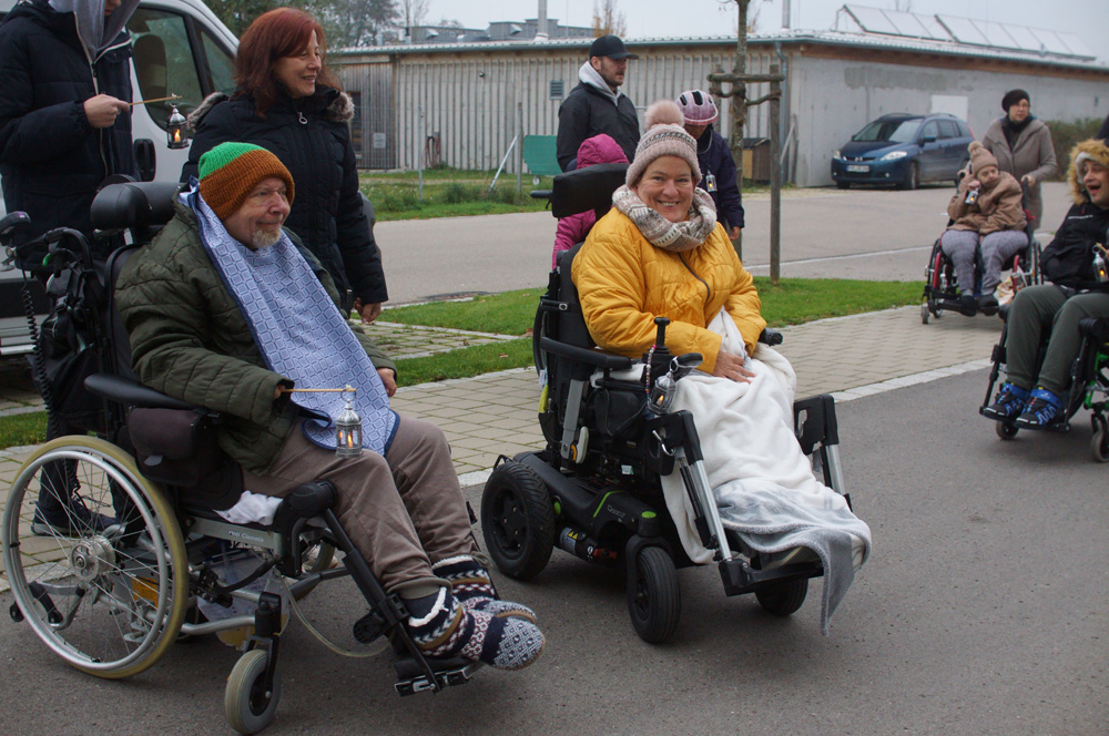 Über 30 Klient:innen und -Mitarbeitende der EJF Hollerhof gGmbH schlossen sich dem Martinsumzug an. Und auch hier flackerte neben dem ein oder anderen Rollstuhl eine kleine Laterne. „Die gemeinsame Zeit mit den Kindern war für unsere Bewohner ein besonderes Erlebnis", so die Mitarbeitenden. "Das Singen und die besondere Atmosphäre der Zusammengehörigkeit können heute, am Martinstag, noch lange nachwirken“.