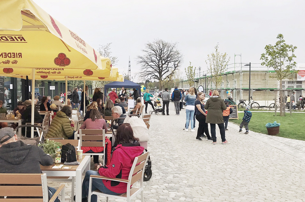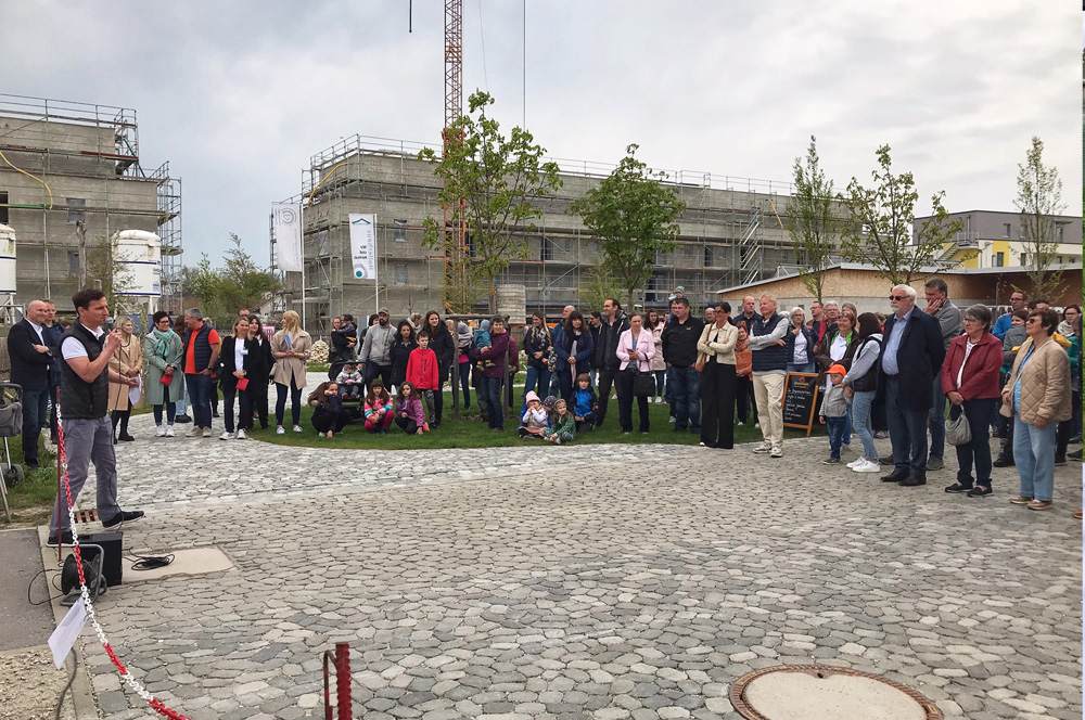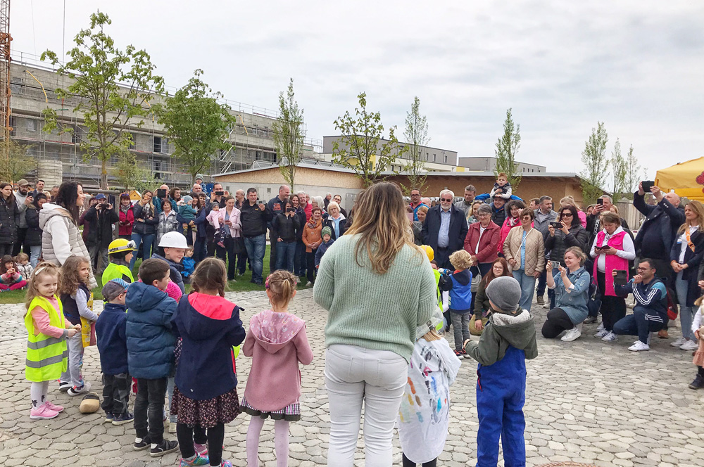 “Wer will fleißige Handwerker seh’n, der muss zu uns Kindern geh’n”, so eröffnete der PZ-Kindergarten Gänseblümchen aus Münchsmünster den Aktionstag mit einem Lied und einer Aufführung. Dafür waren die Kinder in auffallende Westen geschlüpft, hatten Baustellenhelme aufgezogen und zeigten in ihrem Lied recht anschaulich, was sich derzeit während der Woche auf der Baustelle so tut. “Trotz der Hürde durch gestiegene Baukosten liegt unser Bau weiterhin im Zeitplan”, betonte PZ-Geschäftsführer Philip Hockerts und erklärte, dass Spenden für das gemeinnützige Pädagogische Zentrum auch explizit zum Beispiel in die neue Gartenanlage oder die Innenausstattung des neuen Kinderhauses fließen können. Er sowie die künftigen Leitungen von Kindergarten (Marion Mörtl) und Heilpädagogischer Tagesstätte (Andrea Ostermeier) wie auch die Architekten des gesamten Hollerhof von eap Architekten führten daraufhin gruppenweise durch den Rohbau. Das Architektenteam sowie Mitglieder des PZ-Aufsichtsrats waren begeistert von den Baufortschritten. “Der Hollerhof wird mit dem Kinderhaus und der Förderstätte des Hollerhauses ein generationenübergreifender Ort der Begegnung. Ein Gesamtkonzept, bei dem vor allem auch die Natur eine große Rolle spielt”, bestätigte auch Münchsmünsters Bürgermeister Andreas Meyer. Ein “Ort der Begegnung” wird der Hollerhof künftig auch für alle Münchsmünsterer, die sich bereits jetzt auf den neuen Spielplatz freuen, der direkt gegenüber des Begegnungshaus-Cafés gelegen und als Teil der Heilpädagogischen Tagesstätte auch der Öffentlichkeit zugänglich sein wird.