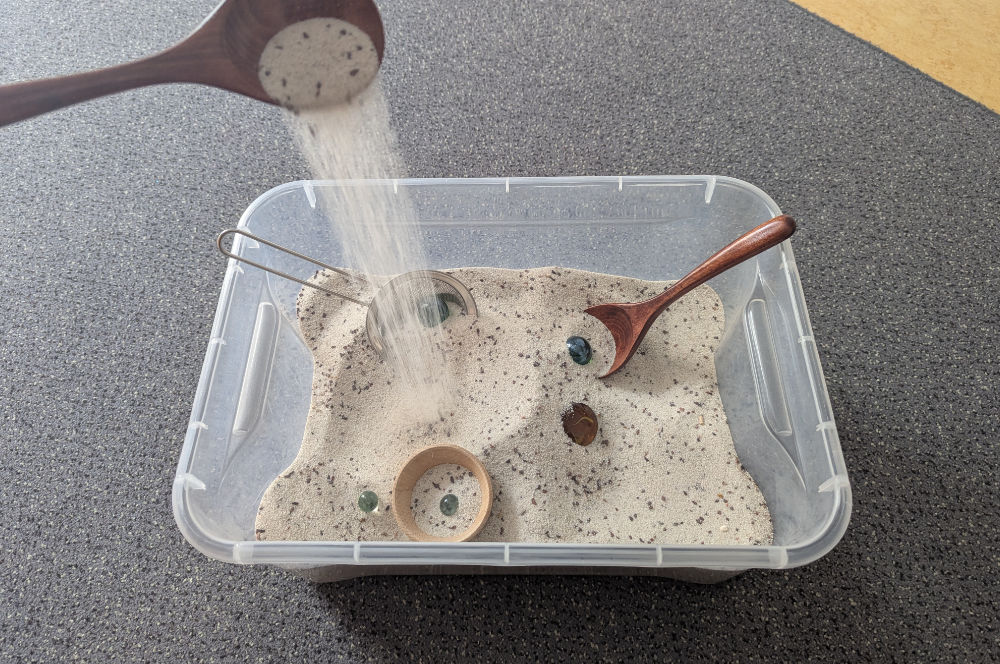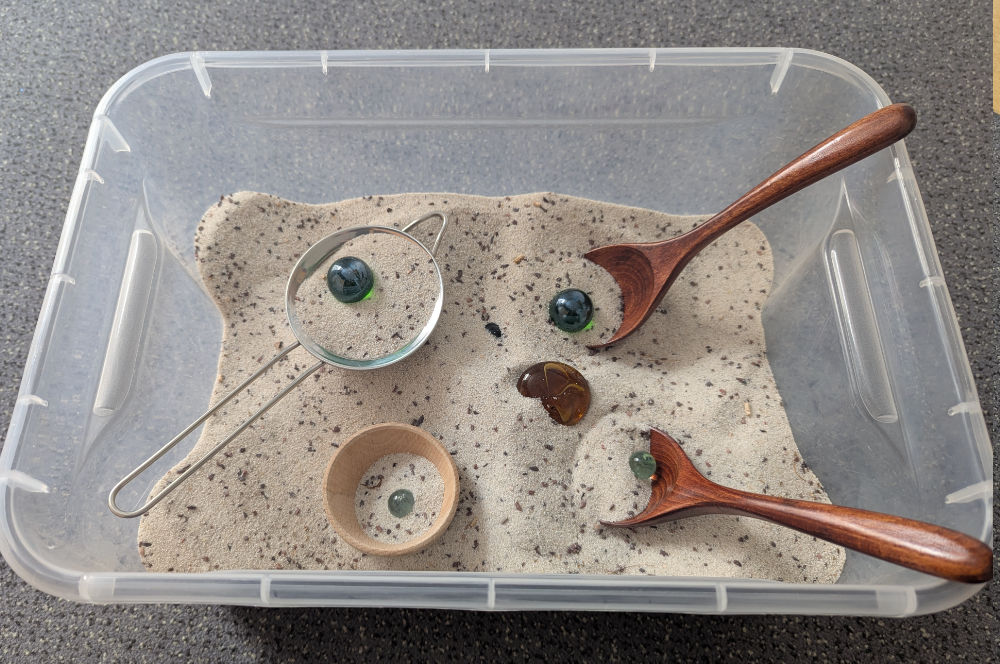 Wir sind angelehnt an die Montessoripädagogik und die Selbstständigkeit der Kinder liegt für uns im Vordergrund. Wir haben hierfür viele Materialien zu “Übungen des täglichen Lebens”, z.B. verschiedene Lern-Tablets, Sensorik Boards, Anziehrahmen und vieles mehr. Ich persönlich mag die Sensorikwannen sehr. Diese können mit verschiedensten Materialien gefüllt werden (Sand, Reis, Linsen, Kastanien). Hierbei lernen die Kinder Schütten, Löffeln, Dosieren, Zielen und trainieren dabei ihre Hand-Augen-Koordination und die Feinmotorik.