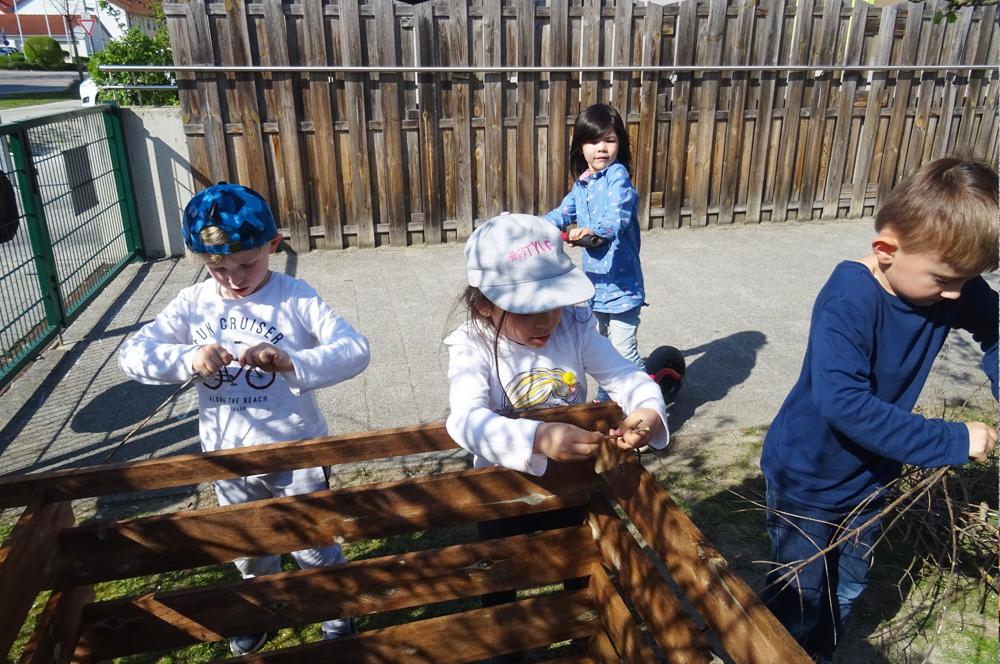 Weiter baute die Kita zusammen mit den Familien und den Mitarbeitern der Audi am Freiwilligentag ein neues Zuhause für Insekten. Aus alten Holzkisten, Stroh, Tannenzapfen, Bambusrohren, Schilf und vielem mehr wurden gemütliche Plätze zum Verstecken geschaffen. Die Kinder nennen es liebevoll ihr „5-Sterne-Hotel”, das seitdem an einem sonnigen, windgeschützten Platz den Insekten als Unterschlupf dient. Auch fleißige Bienen werden von den Kindern immer wieder gesichtet. Sie ruhen sich aus, bevor sie sich an den von den Kindern gesäten Blumen wieder an die Arbeit machen.