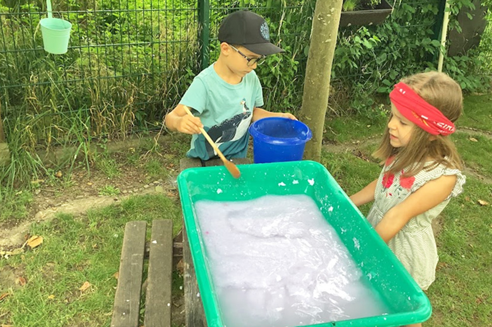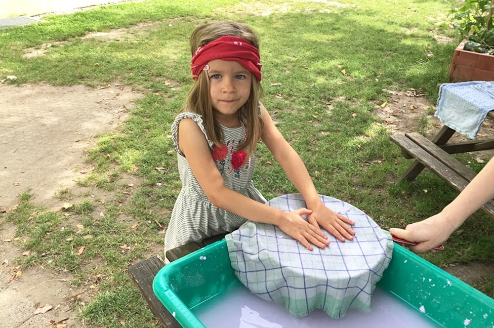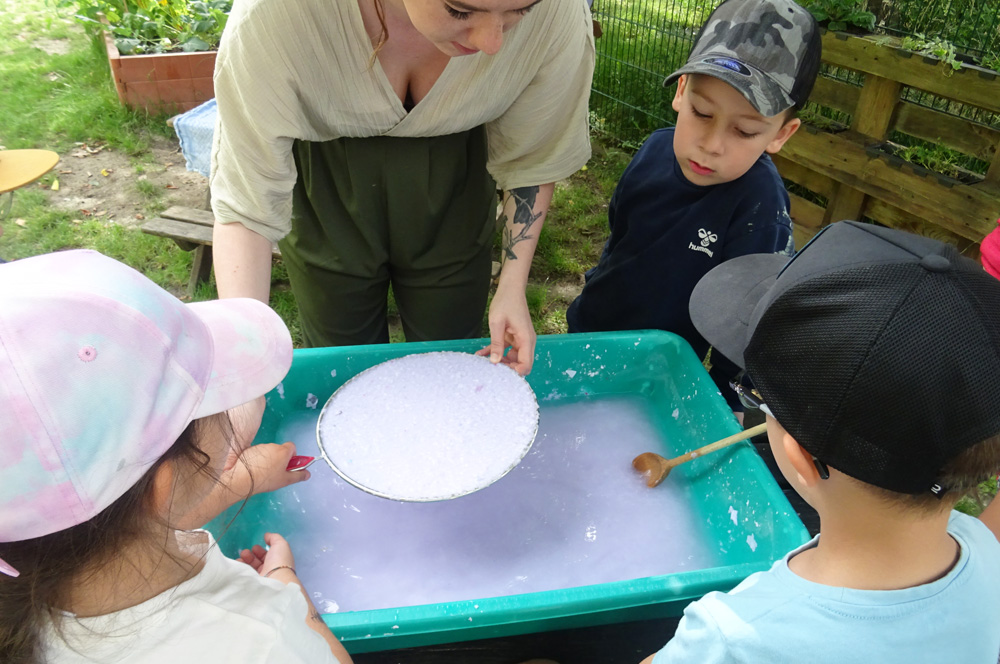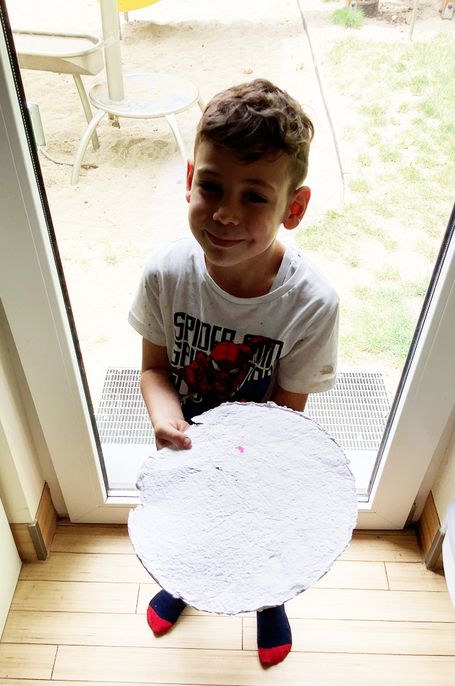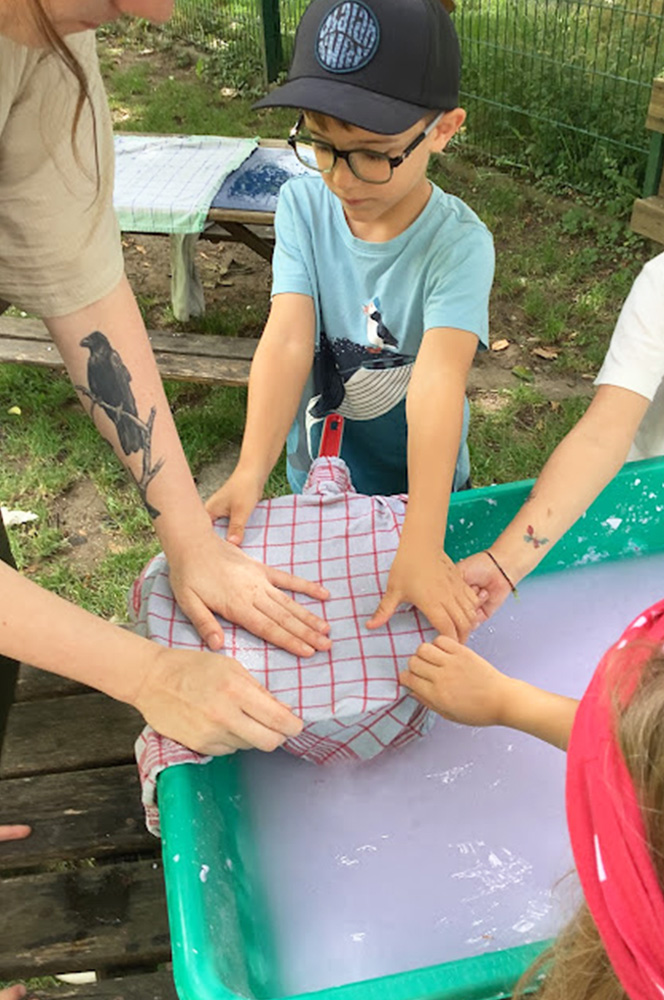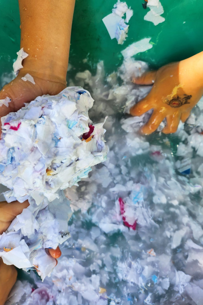 Also ging es los: Papierreste zusammensuchen, zerkleinern und schließlich mit Wasser mixen. Und warten, denn die Papiere mussten erst einmal ordentlich einweichen. Einen Tag später konnten die Kinder dann das Papier schöpfen, um es im Nachgang in der Sonne zu trocknen. Ganz schön viel Arbeit, fanden die Kinder - aber das Ergebnis der Ritter, Prinzen und Prinzessinnen der “Burg Immergrün” kann sich sehen lassen.