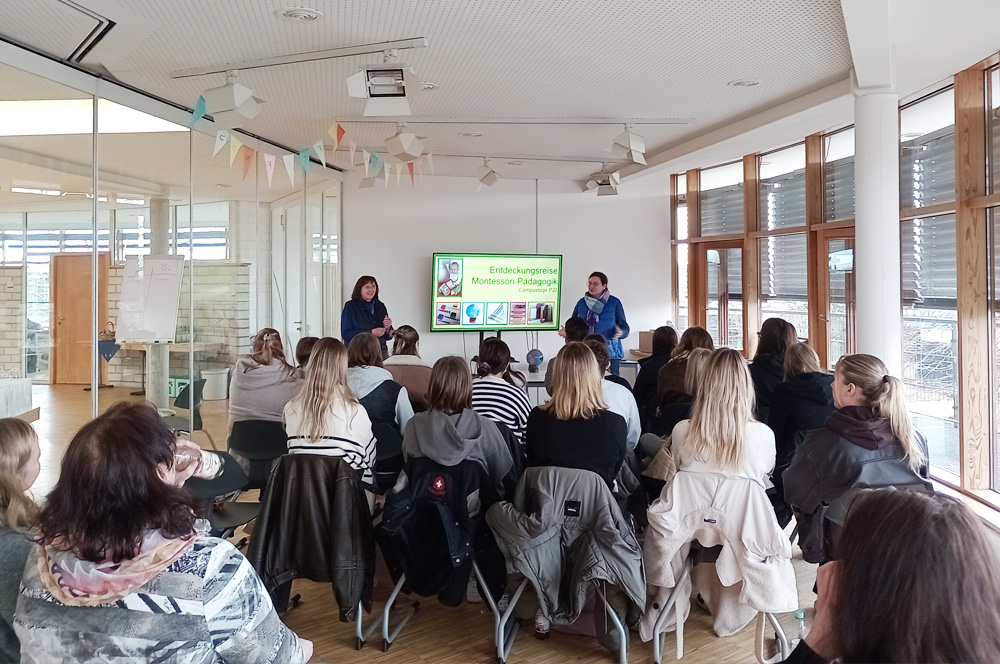 Als besonders bereichernd empfinden die Gäste stets die einstündige Montessori-Einführung. Hierfür konnte das PZ seine beiden Montessori-Dozentinnen gewinnen, die mit vielen Materialien und Beispielen eine wunderbare Orientierung über die Montessoripädagogik geben. Vielen Dank dafür! Die meisten Einrichtungen des Pädagogischen Zentrums arbeiten auf Basis der Montessoripädagogik. Daher unterstützt der Träger auch Weiterbildungen in diesem Bereich, die ebenfalls trägerintern über die eigene Pädagogische Akademie angeboten werden.
