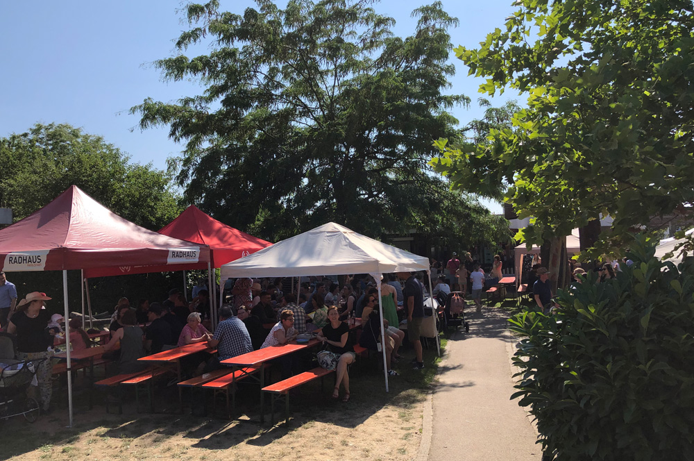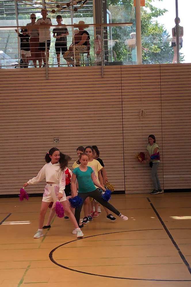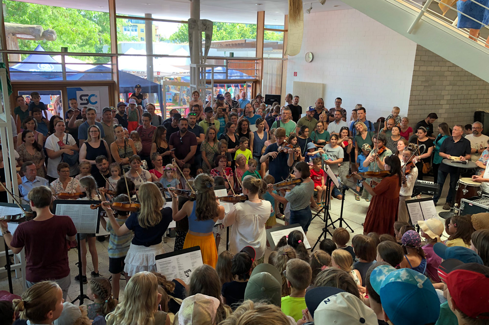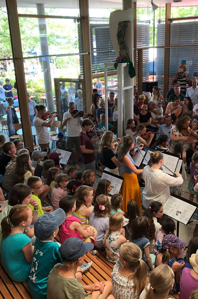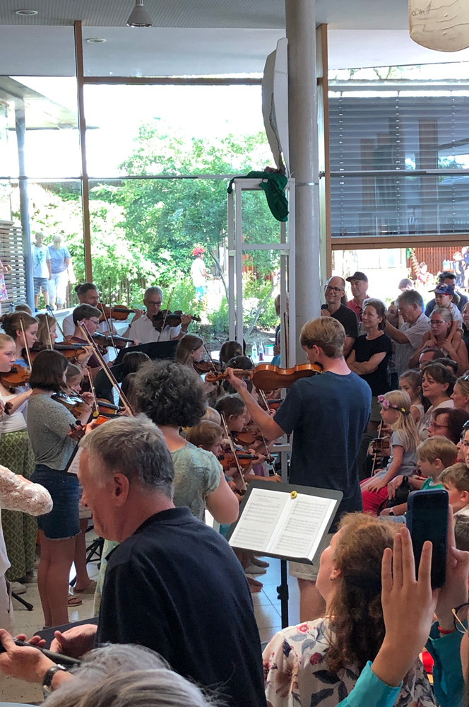 "Nach drei Jahren ohne Sommerfest aufgrund von Corona haben sich viele gefreut, dass unser Sommerfest wieder stattfindet", resümmiert Schulleitung Christina Dreinhöfer. Sie eröffente das Fest um 16 Uhr offiziell mit einer Begrüßung im Rundbau, die der Chor und die Suzuki-Geigen-Kinder untermalten. In der Turnhalle präsentierte sich später noch die Hip Hop Tanzgruppe der Schule.